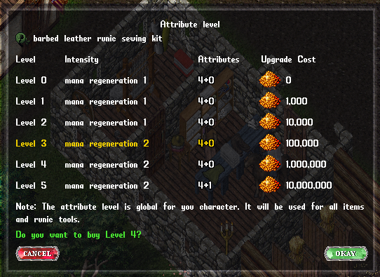Stat training can be bought at NPCs. Both increase (to a maximum of 125 individual and 250 of stat cap with scrolls) or lower (to a minimum 10) of the stat value is possible.